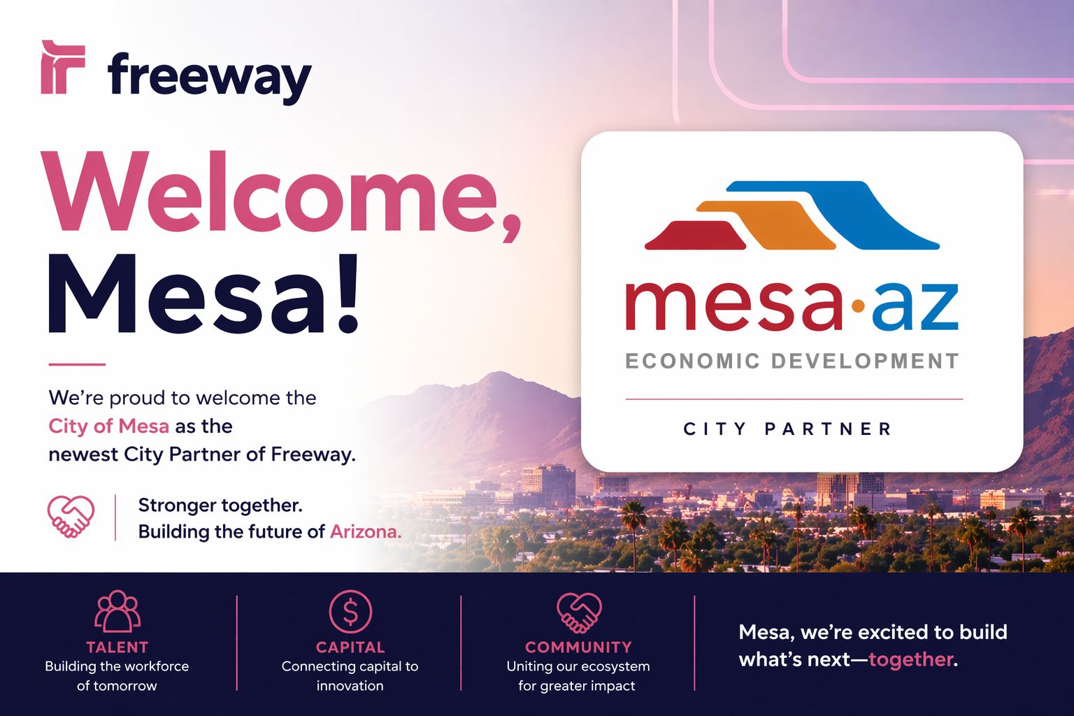 Through this partnership, Mesa will help support the Freeway Dashboard, amplify its local companies, and strengthen access to talent, capital, and community across the region.